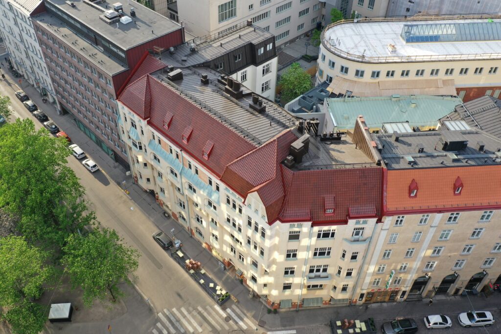 Sisäpihan mansardikattoinen peltikattorakenne uusittiin kantaviin rakenteisiin asti talvityönä suunnittele-toteuta mallisella laskutyöllä. Kattoon rajautuvat ikkunat uusittiin. Työ toteutettiin osittain omalla työvoimalla, osittain peltikattoihin erikoistuneen kumppaniyrityksemme voimin. Katuun rajoittuvan kattopinnan peltikattopinnat pinnoitettiin heinäkuussa 2023.