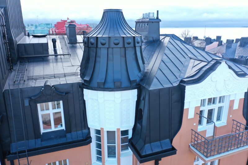 Koristeellisien Jugend-asuinkerrostalojen vesikatot ja julkisivut uusittiin parvekkeineen. Koristeellinen peltikatto on yksi Suomen kauneimmista ja vaikeustaso sen mukainen. Vesikaton lämmöneristystä, tuuletusta ja rakennuksen ilmanvaihtoa parannettiin muuttamatta alkuperäistä rakennuksen ulkomuotoa. Alun perin käsin rapatut kipsikoristeet purettiin ja toteutettiin perinnerappaamalla käsityönä rakennusten historiaa kunnioittaen. Hankkeessa päädyttiin uusimaan neljä parveketta kokonaan, lisäksi yksi terassiparveke raskaskunnostettiin.