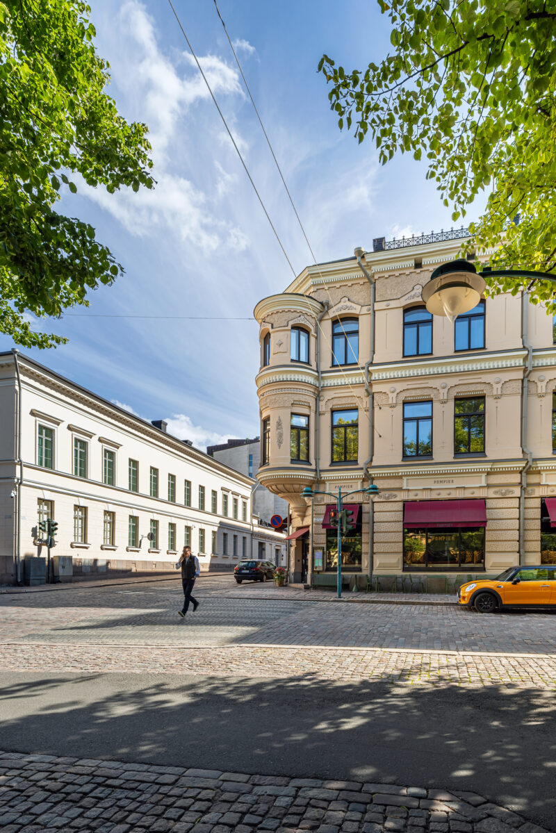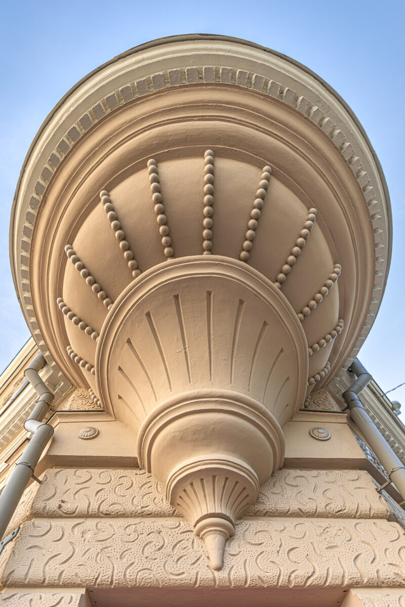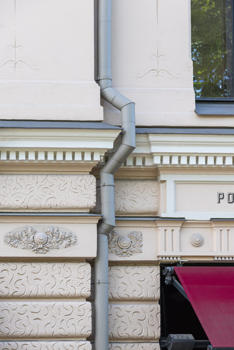 Arvokiinteistön rapatun julkisivun entisöintityöt: kipsikoristeiden uusinta/kunnostus, rappauskorjaukset, maalinpoistokäsittelyt ja maalaustyöt.