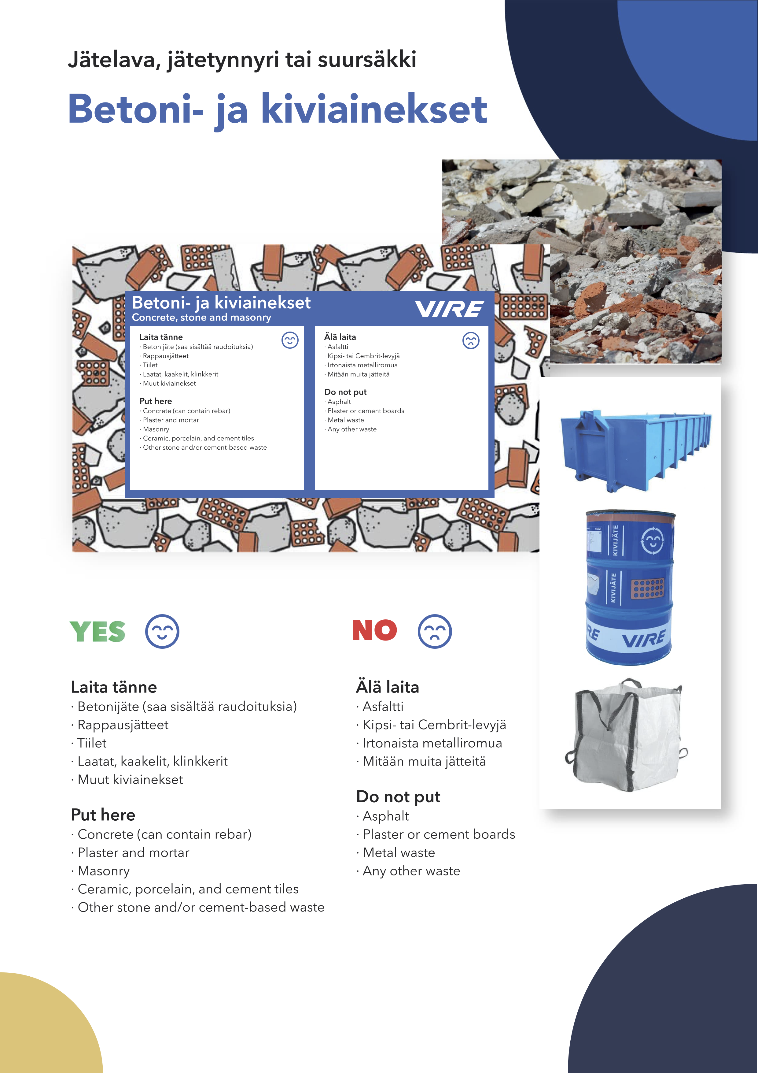 Työmailla on myös usein haasteita tilankäytön vuoksi; Tätä varten käytämme myös omia, pienempiä jäteastioita pienempien määrien kierrätyksessä. Oma kuljettajamme kerää pienempiä astioita muun työmaalogistiikan yhteydessä purkaen ne varastollamme oleville vaihtolavoille. Lajitteluoppaasta esimerkki, jossa näkyy betoni- ja kiviaineiden kierrättämisessä käyttämämme grafiikat ja erilaiset kierrätysastiat.