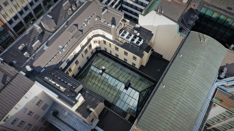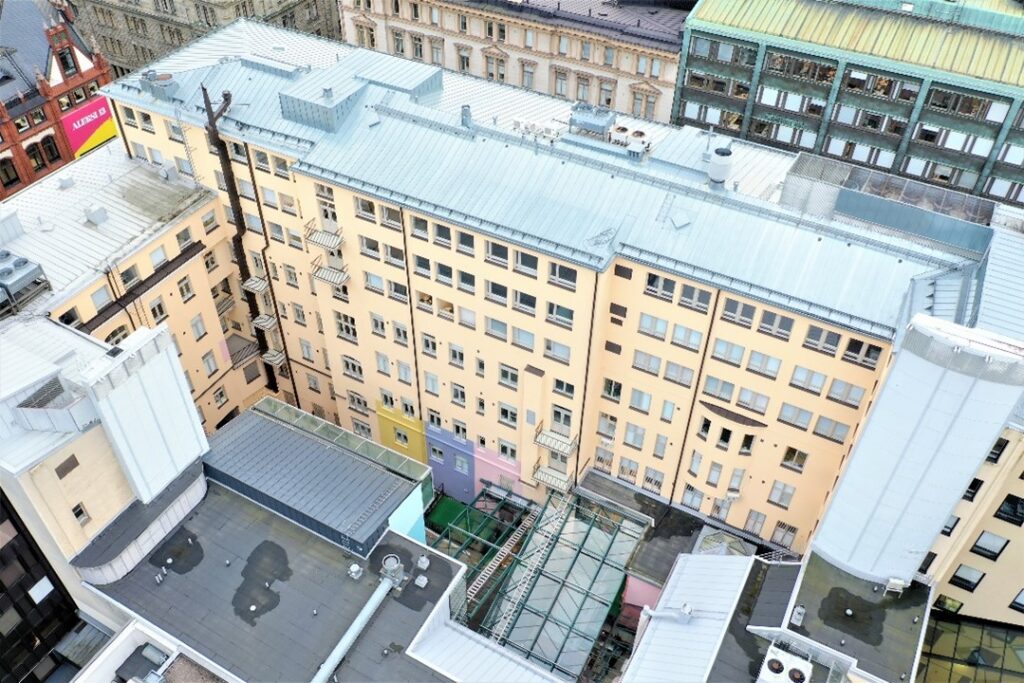 Sisäpihan mansardikattoinen peltikattorakenne uusittiin kantaviin rakenteisiin asti talvityönä suunnittele-toteuta mallisella laskutyöllä. Kattoon rajautuvat ikkunat uusittiin. Työ toteutettiin osittain omalla työvoimalla, osittain peltikattoihin erikoistuneen kumppaniyrityksemme voimin. Katuun rajoittuvan kattopinnan peltikattopinnat pinnoitettiin heinäkuussa 2023.