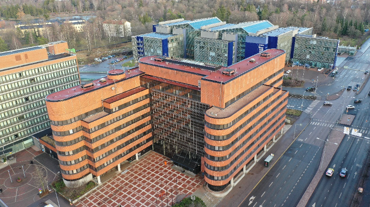 Julkisivujen kaikkien ikkunoiden välisten rankaseinäosuuksien (n. 1800m2) uusimistyöt pellityksineen ja lasituslistaliittymineen. Julkisivuja kiertävien aurinkosuojalasien (540kpl) purku, lasien kiinnitysten korjaustyöt ja uudelleenasennus. Vesikattorakenteiden uusiminen (n. 1800m2) kaatokorjauksineen, sekä kattokaivojen ja niiden liitosten uusiminen umpivirtausjärjestelmään. Kattoterassin (110m2) rakenteiden uusiminen kantavasta laatasta ylöspäin.