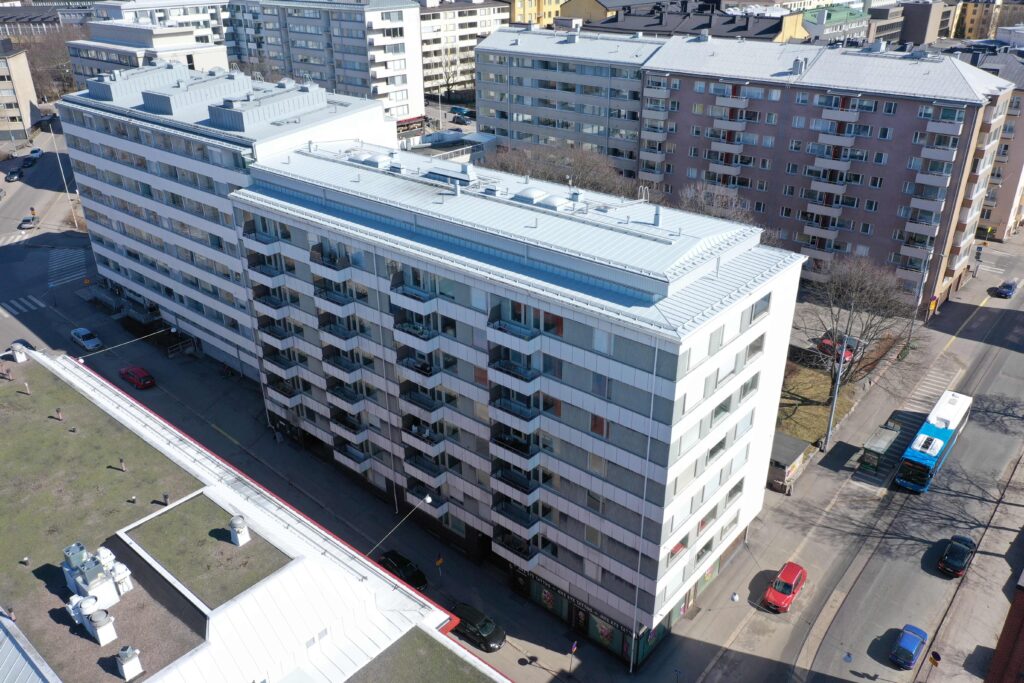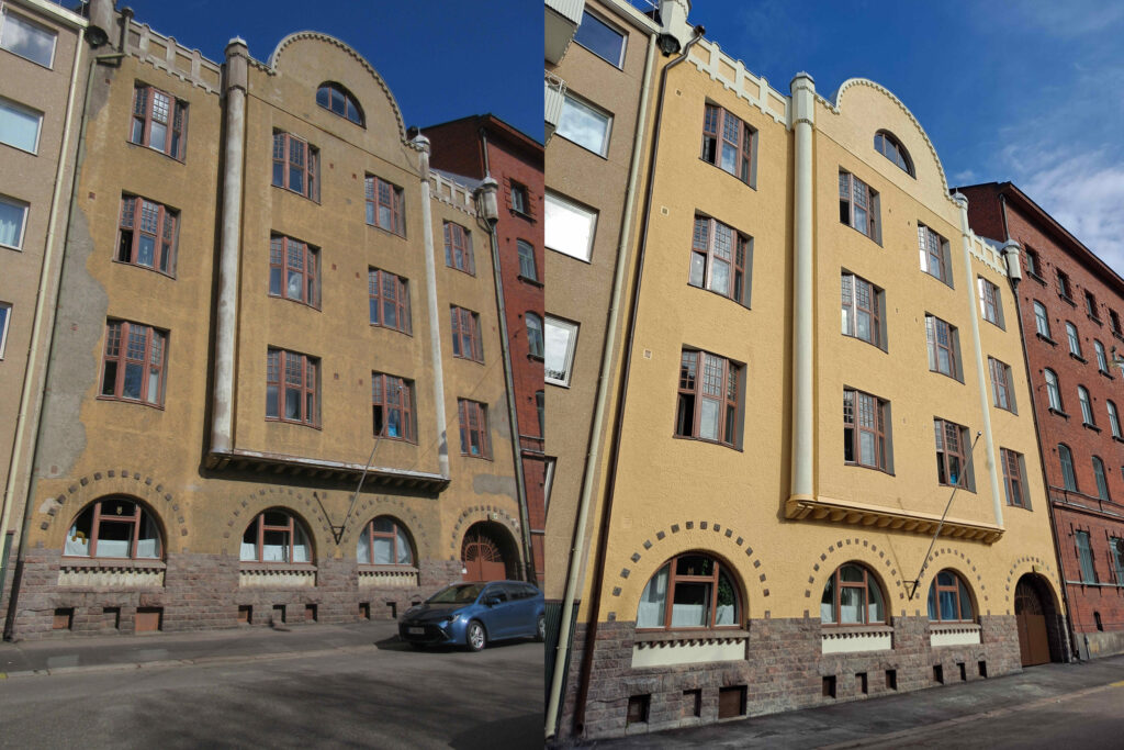 Vuoden 2021 urakassa uusimme kauttaaltaan kahden katujulkisivun rappaukset. Talvella tehdyn oman kuntotutkimuksemme perusteella päädyimme vaihtamaan korjaustavan parempikuntoisten katujulkisivujen osalta paikkarappaukseksi. Tämä vähensi huomattavasti vuokralaishaittaa sekä säästi asiakkaan ja luonnon resursseja asiakaslupauksemme mukaisesti.